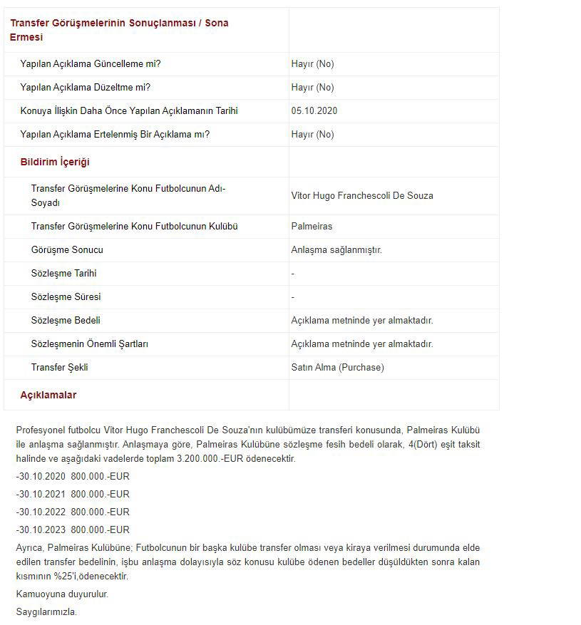 açıklamada, "Brezilya'nın Palmeiras Kulübünün profesyonel futbolcusu Vitor Hugo