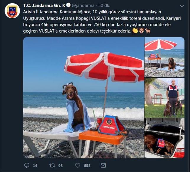 'Artvin İl Jandarma Komutanlığınca; 10 yıllık görev süresini tamamlayan uyuşturucu madde arama köpeği 'Vuslat'a emeklilik töreni düzenlendi. Kariyeri boyunca 466 operasyona katılan ve 750 kilodan fazla uyuşturucu madde ele geçiren Vuslat'a emeklerinden dolayı teşekkür ederiz.'