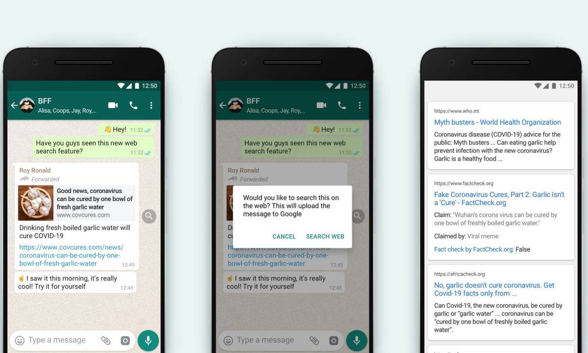Uygulama, beş veya daha fazla kişinin zincirlerinden iletilen mesajların yanında görünecek bir büyüteç simgesi ekledi. Büyütece dokunulduğunda, komplo teorileri veya yanlış bilgi içeriyorsa bunun ortaya çıkaracak şekilde iletinin içeriği çevrimiçi olarak aranır.