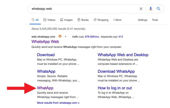 2,2 milyarın üzerindeki kullanıcı sayılı WhatsApp Web’i, arama dilini İngilizce yapıp Google’da aratınca, sonuçlarda “WhatApp” bağlantısı ile karşılaşılıyor.