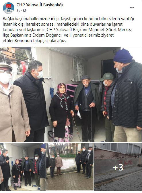 "Bağlarbaşı mahallemizde ırkçı, faşist, gerici kendini bilmezlerin yaptığı insanlık dışı hareket sonrası, mahalledeki bina duvarlarına işaret konulan yurttaşlarımızı CHP Yalova İl Başkanı Mehmet Gürel, Merkez İlçe Başkanımız Erdem Doğancı ve il yöneticilerimiz ziyaret ettiler.Konunun takipçisi olacağız."