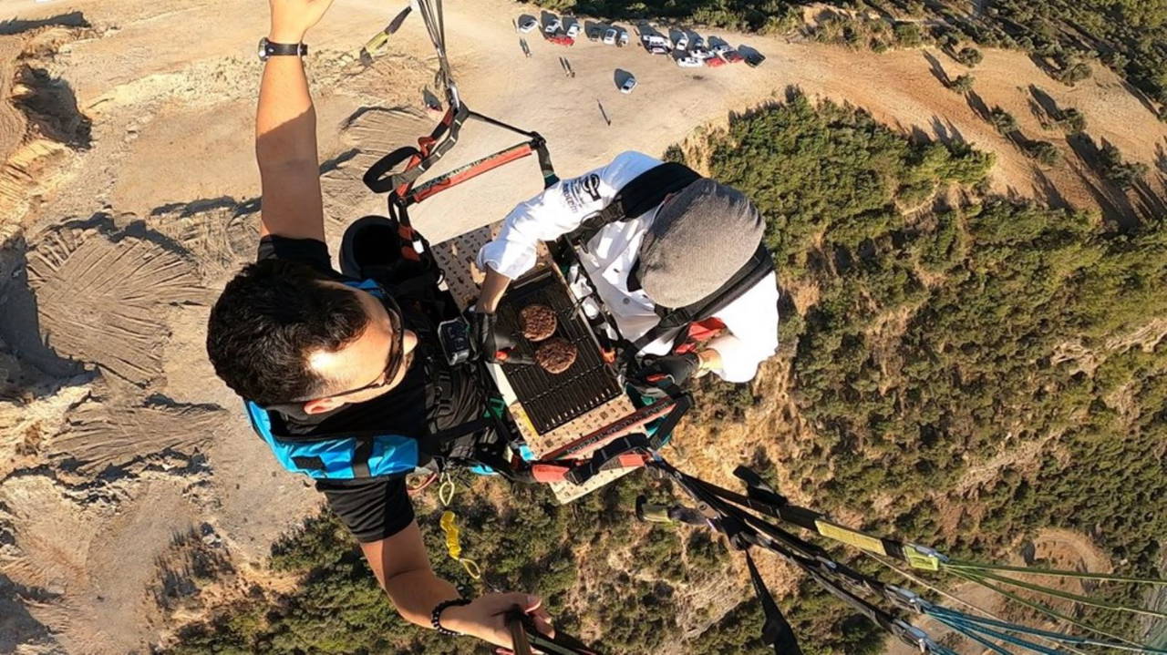 Daha sonra Aydal, sos, marul ve turşusuyla hazır hale getirdiği hamburgerleri Avcu ile havada yedi.
