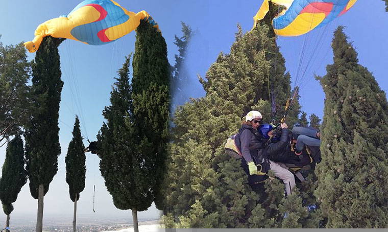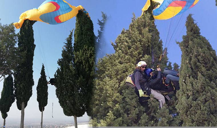 Olay, Pamukkale ilçesindeki travertenler bölgesinde meydana geldi. Yamaç paraşütü pilotu Furkan Yurtsev ile yolcusu olan Hakan Göksu, iniş yaptıkları sırada kontrolü kaybederek ağaç dallarına asılı kaldı.Çevredekilerin ihbarı üzerine olay yerine gelen itfaiye ve 112 ekipleri, Yurtsev’i ile Göksu'yu kurtardı. Pilot ve yolcu ambulansta ayakta tedavi edildi.