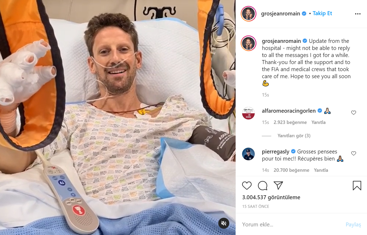 Kazadan küçük yanıklarla kurtulan Grosjean, sağlık durumunu Instagram'dan yayınladığı bir video mesaj yoluyla açıkladı.