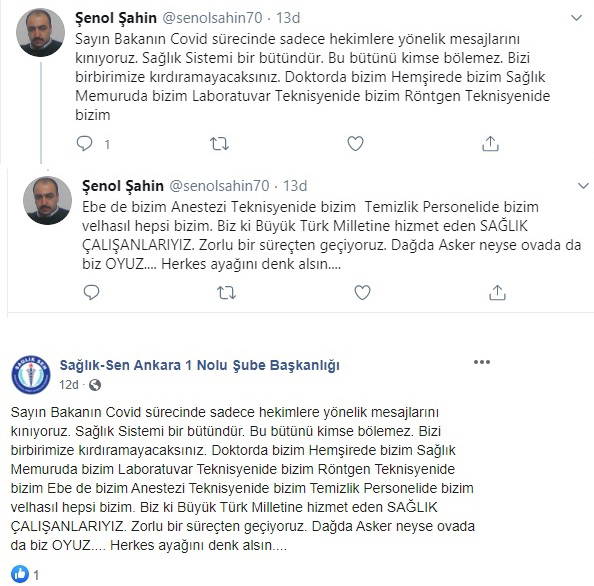 "Sayın Bakanın Covid sürecinde sadece hekimlere yönelik mesajlarını kınıyoruz. Sağlık Sistemi bir bütündür. Bu bütünü kimse bölemez. Bizi birbirimize kırdıramayacaksınız. Doktorda bizim Hemşirede bizim Sağlık Memuruda bizim Laboratuvar Teknisyenide bizim Röntgen Teknisyenide bizim Ebe de bizim Anestezi Teknisyenide bizim Temizlik Personelide bizim velhasıl hepsi bizim. Biz ki Büyük Türk Milletine hizmet eden SAĞLIK ÇALIŞANLARIYIZ. Zorlu bir süreçten geçiyoruz. Dağda Asker neyse ovada da biz OYUZ.... Herkes ayağını denk alsın...."