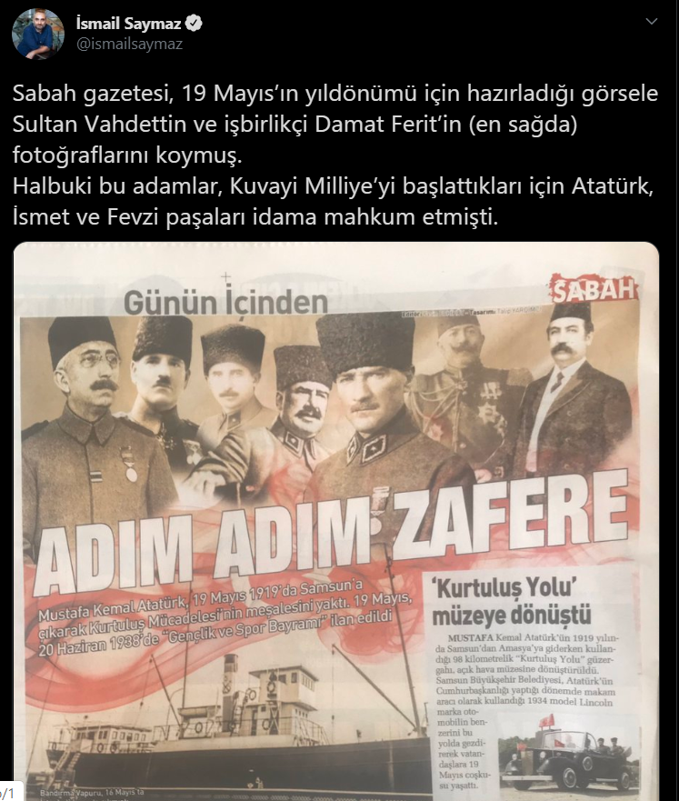 Sabah gazetesi, Atatürk’ün Samsun’a çıkarak Kurtuluş Savaşı’nı başlattığı 19 Mayıs 1919’un 101’inci yıldönümü için hazırladığı ‘Adım adım zafere’ başlıklı haberinde, Atatürk hakkında rütbelerinin sökülmesi ve idam kararı veren Osmanlı Padişahı Vahdettin ile Damat Ferit’in görsellerini kullandı. Gazete, 2013 yılında internet sitesinde yayımladığı bir haberde bile Damat Ferit’ten “işbirlikçi” olarak bahsetmişti. Sabah gazetesi, haberin görselinde, Atatürk ve mücadele arkadaşlarının yanına Osmanlı Padişahı Vahdettin ile Damat Ferit’i de koydu. Haberde şu ifadelere yer verildi: