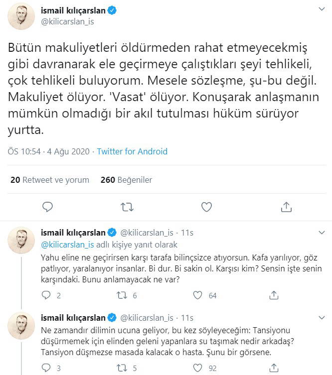 Twitter hesabından paylaşımlarda bulunan İsmail Kılıçarslan, “Konuşarak anlaşmanın mümkün olmadığı bir akıl tutulması hüküm sürüyor yurtta” dedi.
