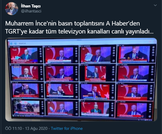 RTÜK Üyesi İlhan Taşçı da durumu sosyal medya hesabından, ekran görüntüleriyle paylaşarak” Muharrem İnce’nin basın toplantısını A Haber’den TGRT’ye kadar tüm televizyon kanalları canlı yayınladı” dedi.