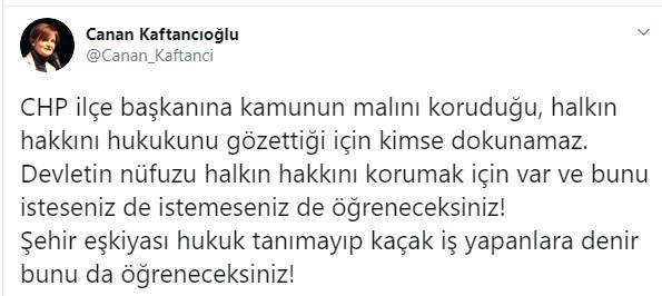 Kaftancıoğlu ise, "CHP ilçe başkanına kamunun malını koruduğu, halkın hakkını hukukunu gözettiği için kimse dokunamaz. Devletin nüfuzu halkın hakkını korumak için var ve bunu isteseniz de istemeseniz de öğreneceksiniz!