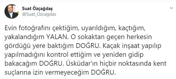 Yandaşların hedefindeki Özçağdaş, sosyal medya hesabından açıklama yaparak, "Evin fotoğrafını çektiğim, uyarıldığım, kaçtığım, yakalandığım YALAN. O sokaktan geçen herkesin gördüğü yere baktığım DOĞRU. Kaçak inşaat yapılıp yapılmadığını kontrol ettiğim ve yeniden gidip bakacağım DOĞRU. Üsküdar'ın hiçbir noktasında kent suçlarına izin vermeyeceğim DOĞRU" ifadelerini kullandı.