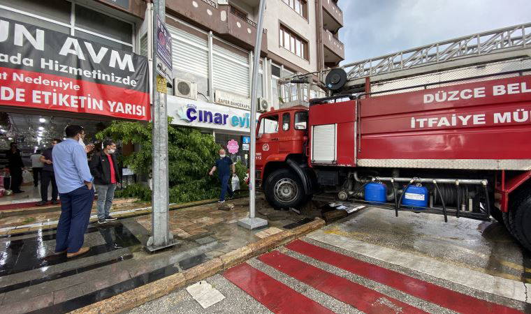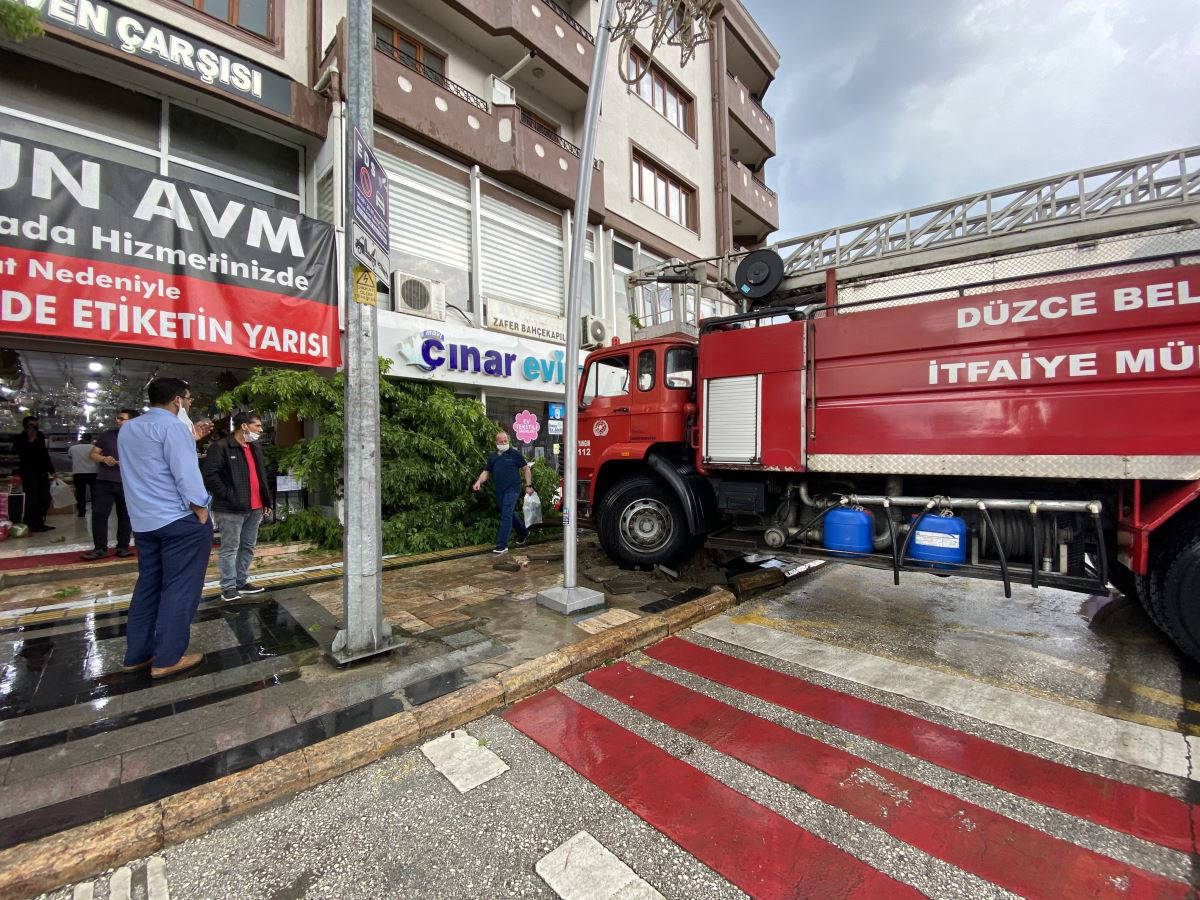 Olay yerine seyir halinde olan Emin Hatakoy idaresindeki 81 AE 522 plakalı itfaiye aracı Celal Kasapoğlu Caddesi üzerinden Bolu Caddesi istikametine dönmek isterken, Bolu Caddesi istikametinden İstanbul Caddesi istikametine seyir halinde olan Sabih Ak idaresindeki 81 FD 213 plakalı otomobil ile çarpıştı. Çarpmanın etkisiyle direksiyon hakimiyetini kaybeden itfaiyeci ağaca çarparak durabildi.