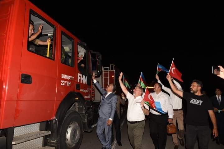 AKP İl başkanı Yusuf Ahlatcı ve belediye başkanı Halil İbrahim Aşgın ve beraberindeki parti ve belediye yöneticileri ile birlikte Azerbaycan İtfaiye araçlarını durdurarak itfaiyecilerle bir süre vakit geçirdiler.