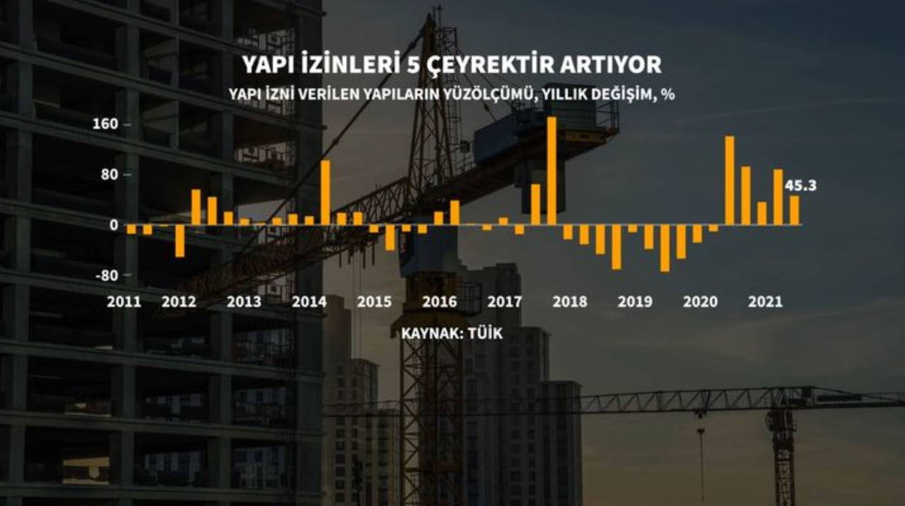 Bloomberght'nin haberine göre; belediyeler tarafından verilen yapı ruhsatlarının 2021 yılının ilk altı ayında bir önceki yılın aynı dönemine göre bina sayısı yüzde 88,4, yüzölçümü yüzde 45,3, değeri yüzde 93,7, daire sayısı yüzde 49,8 arttı.