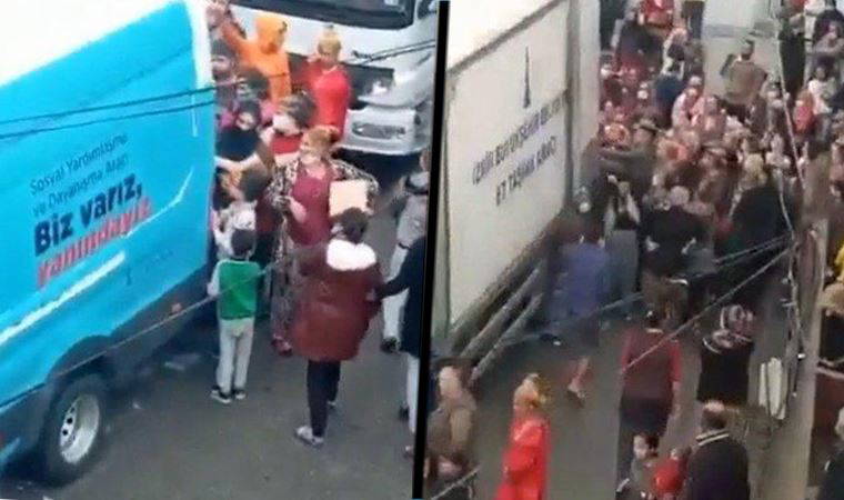 İzmir’in Konak ilçesi 2. Kadriye Mahallesi’nin muhtarlık binası önünde, İzmir Büyükşehir Belediyesi’nin yardım kolileri mahalle sakinlerine ulaştırıldığı sırada bir süre izdiham yaşandı. Salgın tedbirlerinin de uygulanmadığı görüntülere yansıdı.