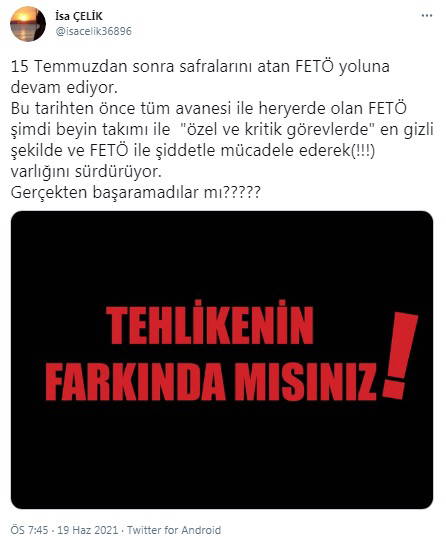 Twitter hesabından yaptığı paylaşımda, 15 Temmuzdan sonra safralarını atan FETÖ'nün yoluna devam ettiğini belirten İsa Çelik, "Bu tarihten önce tüm avanesi ile heryerde olan FETÖ şimdi beyin takımı ile "özel ve kritik görevlerde" en gizli şekilde ve FETÖ ile şiddetle mücadele ederek(!!!) varlığını sürdürüyor" ifadelerini kullandı.