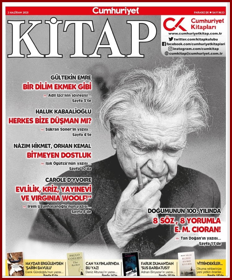 Doğumunun 100’üncü yılında düşünür, yazar E. M. Cioran (8 Nisan 1911 - 20 Haziran 1995); yaşam, acı, olgunluk, zaman, incinmiş ruhlar, varoluş üzerine 8 yapıtından 8 “söz”ü üzerine 8 yorumla bütünlenen bir irdelemeyle kapağımızda. Tan Doğan’ın yazısı...