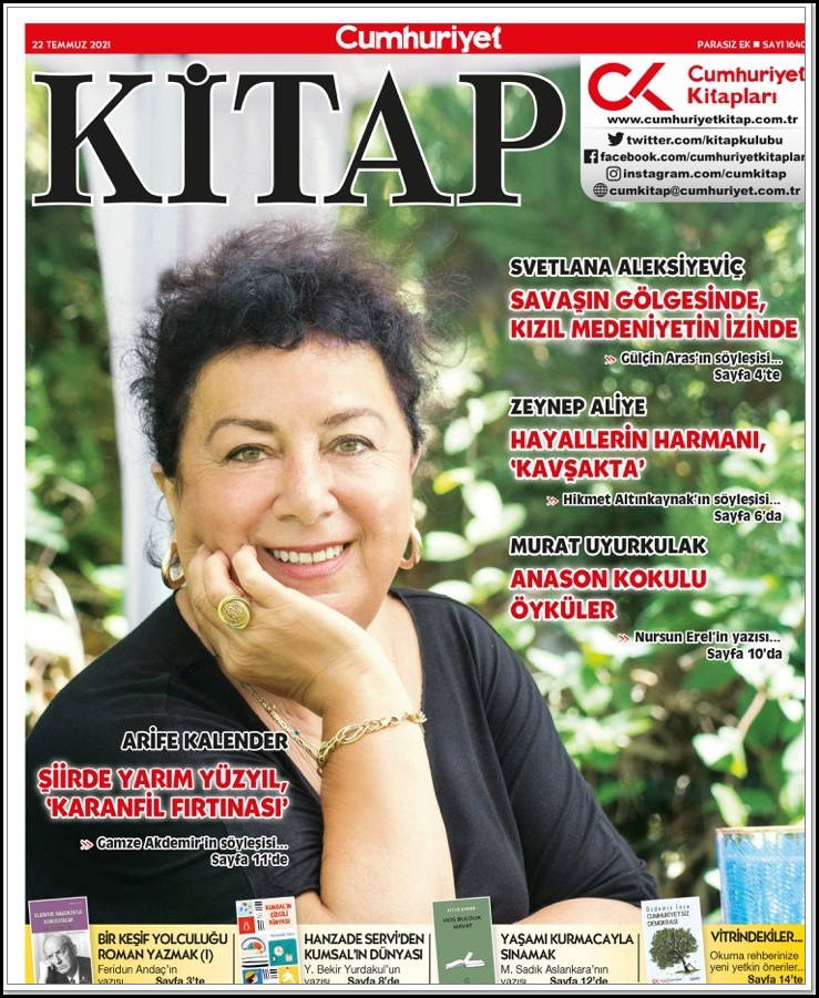 - 1640. sayısı BUGÜN yayınlanan Cumhuriyet Kitap Dergi’nin kapağında; “Ömrümün özeti” sözleriyle nitelediği, şiirin değiştireceğine inancıyla, farklı bir yel estirmesi, çoraklaştığımız şu günlerde yaşamı, doğayı ve aşkı anımsatması umuduyla buluşturduğunu ifade ettiği şiir seçkisi Karanfil Fırtınası (İmgenin Çocukları Yayınevi) ile şiirde yarım yüzyılı geride bırakan Arife Kalender yer alıyor. Gamze Akdemir'in söyleşisi...