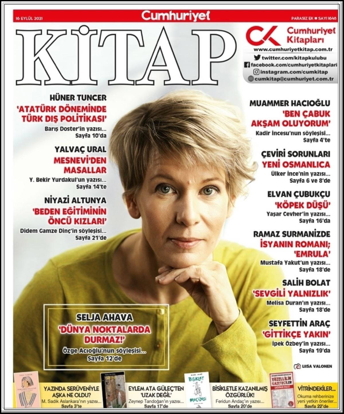 - Cumhuriyet Kitap Dergi’nin BUGÜN yayınlanan 1648. sayısının kapağında; Avrupa Birliği Edebiyat Ödüllü Gökten Düşen Şeyler (Timaş Yayınları) isimli yapıtıyla Finlandiya’nın en sevilen yazarlarından Selja Ahava yer alıyor. Kesintiye uğramış yaşamlar, parçalanan kimlikler, keder, anlaşılma arzusu ve insanın kapanma ihtiyacı hakkındaki, Edebi bir peri masalı niteliğindeki dokunaklı hikâyesinde Ahava; zaman, sevginin gücü ve değişimin kaçınılmazlığı üzerine uzun soluklu bir düşünce sunuyor. Özge Acıoğlu’nun söyleşisi...
