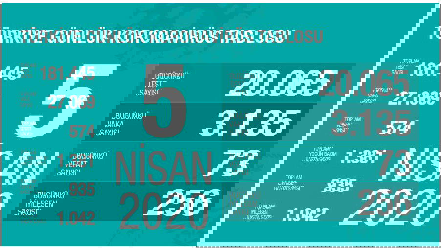 Sağlık Bakanı Fahrettin Koca, yeni koronavirüs raporunu açıkladı. Koca'nın açıkladığı bilgilere göre Türkiye'de koronavirüs nedeniyle yaşamını yitirenlerin sayısı 73 kişi daha artarak 574'e yükseldi. Bakan Koca, ayrıca 3 bin 135 vakanın daha olduğunu açıkladı. Bugünkü sayılarla birlikte Türkiye'deki koronavirüs vakalarının sayısı 27 bin 69'a yükselmiş oldu.