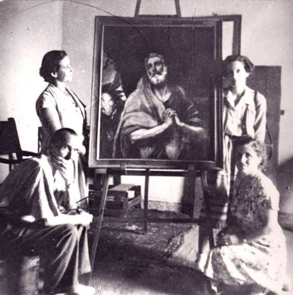Fotoğraf altı: Nikos Kazancakis, eşi Eleni, Yvonne Metral ve Lucienne Fleury ile El Greco’nun Toledo’daki evindeler. (Eylül 1950)