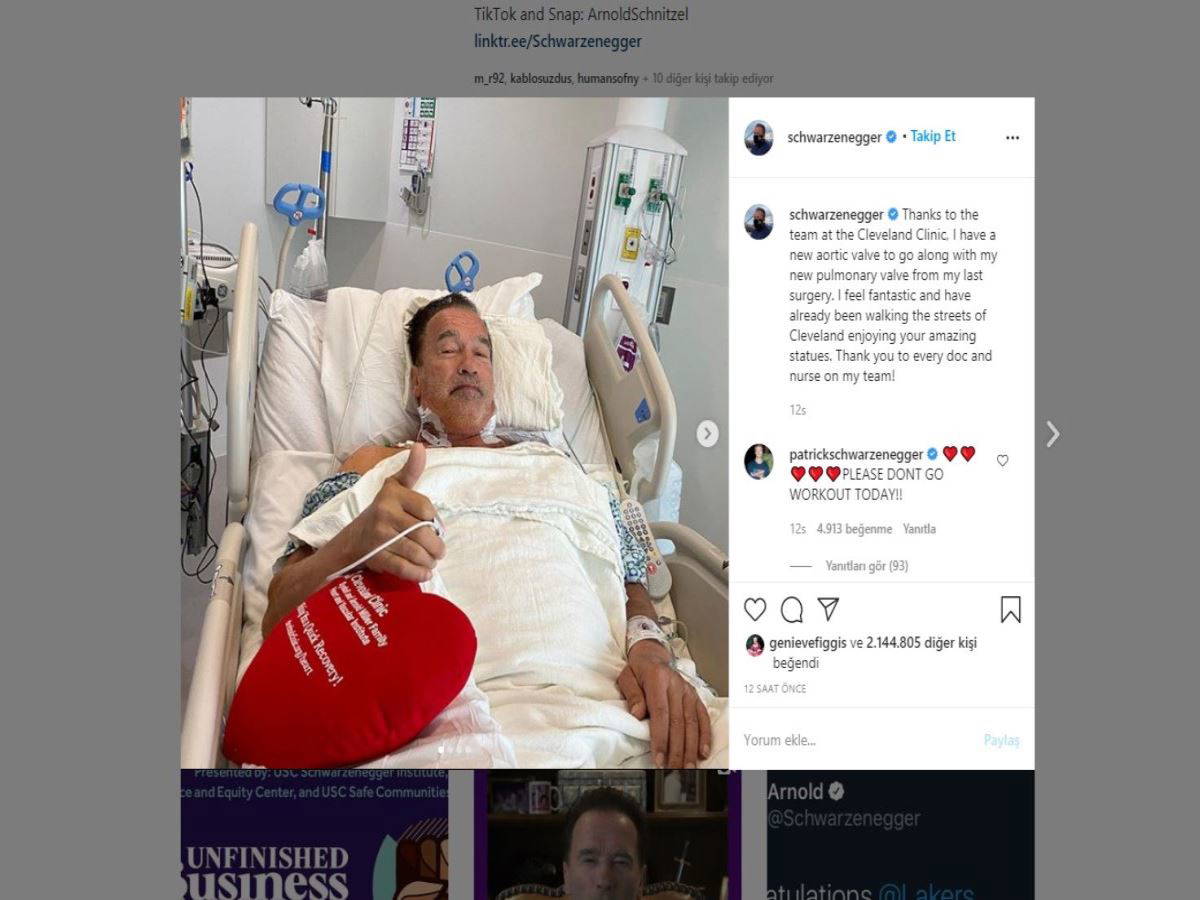 Sosyal medya hesabından hastane odasından bir fotoğrafının da olduğu bir paylaşım yapan Schwarzenegger, "Cleveland Clinic’teki doktorlara teşekkür ediyorum. Önceki ameliyatımda değişen pulmoner kapağıma eşlik eden yeni bir aort kapağım var. Şimdiden mükemmel hissediyorum. Cleveland sokaklarında yürüyerek inanılmaz heykellerinizin tadını çıkarıyorum" dedi.