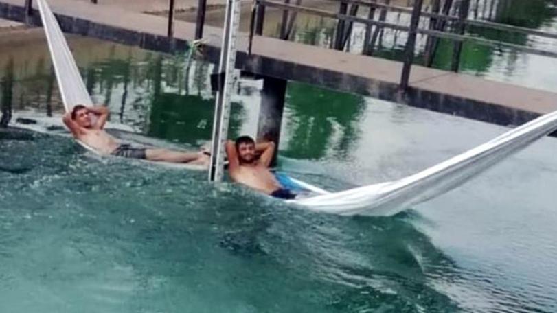 Şaşıran çevre sakinlerinin uyarılarına aldırış etmeyen gençler, gülerek hamakta suyun içerisinde sırt üstü yatıp, serinledi.