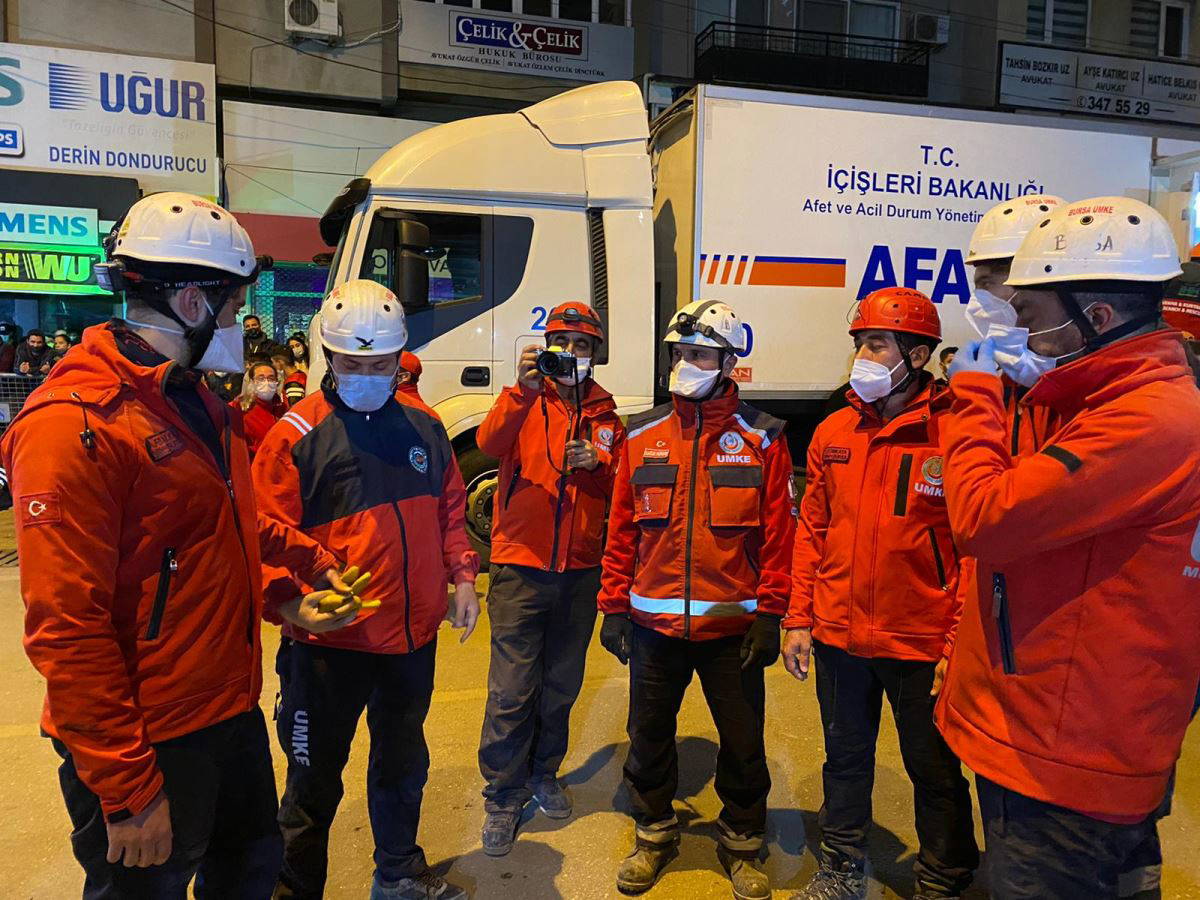 Bursa UMKE Tim Lideri Ali Faruk Balkan, "Deprem olduktan hemen sonra toplam 18 kişi 3 araçla birlikte İzmir’e geldik. Geldikten sonra koordinatör arkadaşlarla, ilk geceden enkaz ekibiyle göreve başladık. Bugün 4 buçuk gibi buradaki enkaz alanına geldik. Maalesef bir tane yaşamını yitiren hastamız oldu. Daha sonra, 33 saat geçtikten sonra bizi mutlu eden Ahmet Amca’yı AFAD’la beraber kurtardık. Saat 00.30’da onu enkazdan çıkardık. 1 Kasım benim doğum günüm, bana doğum günü sürprizi oldu. Arkadaşlarımızın özverili çalışmasıyla beraber başardık. Bizim için moral oldu. Yukarı çıkarken amcanın yaşadığını bilmiyordum. Amcanın yanına gittik ve hareketleri ve konuşmasıyla, yüz üstü yatar bir şekilde nefes aldığını saptadık. İlk yanına gittiğimizde konuşmuyordu, sadece hareketi vardı. Etrafını biraz daha açtıktan sonra, amcanın yüzü açıldı ve konuşmaya başladı. O anda profesyonelliğimizi kaybetmedik ama mutluluktan kendimizi kaybettik. Biz de serum uygulaması ve standart uygulamalar yaptık. Amcanın bilinci açıldı. Ekiplerle beraber aşağı taşıdık. Ambulansa devrettik ve naklini sağladık. Enkazın üstünde sürekli çalışan arama- kurtarma ekiplerine, diğer kuruluşlara çok teşekkür ediyorum. Böyle giderse daha çok can kurtaracağız" dedi.