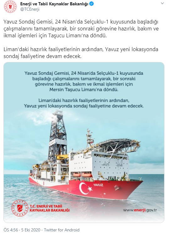 "Yavuz Sondaj Gemisi, 24 Nisan'da Selçuklu-1 kuyusunda başladığı çalışmalarını tamamlayarak, bir sonraki görevine hazırlık, bakım ve ikmal işlemleri için Taşucu Limanı'na döndü. Liman'daki hazırlık faaliyetlerinin ardından, Yavuz yeni lokasyonda sondaj faaliyetine devam edecek."