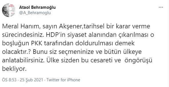 ''Meral Hanım, sayın Akşener, tarihsel bir karar verme sürecindesiniz. HDP’in siyaset alanından çıkarılması o boşluğun PKK tarafından doldurulması demek olacaktır. Bunu siz seçmeninize ve bütün ülkeye anlatabilirsiniz. Ülke sizden bu cesareti ve öngörüşü bekliyor.''