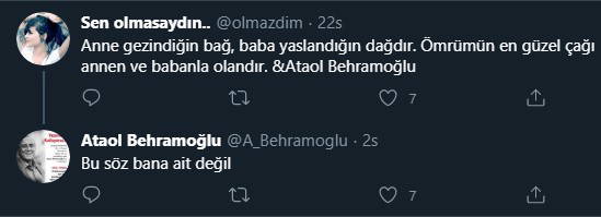 Ataol Behramoğlu sosyal medyada “Benim Öğrendim ki adıyla alt alta dizilen sözlerle bir ilgim yok. Lütfen bu saçmalık tekrar edip durmasın. Anne gezindiğin bağ diye başlayan bir başka saçmalık var. Onunla da ilgim yok” açıklamasını yaptı.