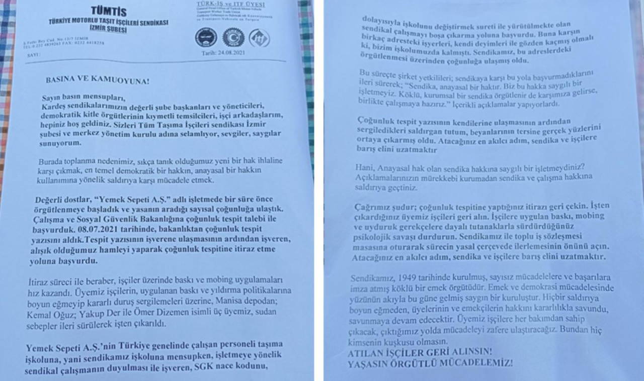 TÜMTİS'te örgütlü Yemeksepeti işçileri tarafından yapılan basın açıklamasının tam metni ise şu şekilde: