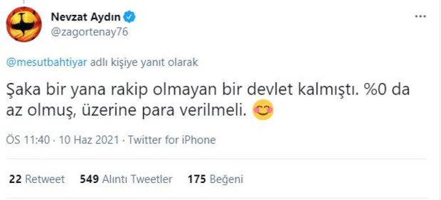 Yavaş’ın paylaşımına ise Yemeksepeti’nin CEO’su Nevzat Aydın’dan yanıt geldi. Aydın, “Dünyada bir ilk olmuş başkanım. Rekabet güzel şey. Sizi seviyoruz” dedi. Aydın devamında", “Rakip olmayan bir Devlet kalmıştı” paylaşımında bulundu. Aydın'ın paylaşımına ise kullanıcılardan tepki geldi.