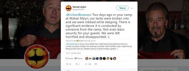 Yemeksepeti’nin kurucusu olan teknoloji girişimcisi Nevzat Aydın’ın ünlü iş insanı Richard Branson’a ait safari kampında soyulduğu attığı tweet ile ortaya çıktı. 2015 yılında kurduğu platformu 589 milyon dolar karşılığında satan ve yemeksepeti’ndeki görevine devam eden Aydın bu hırsızlık vakasının içeriden birisinin işi olduğunu öne sürdü.