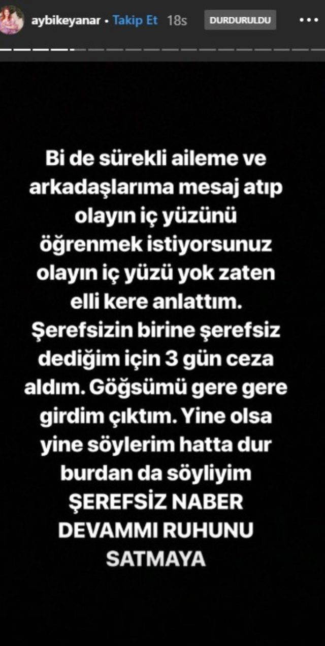 Cezaevine neden girdiği yönünde de açıklama yapan Yanar, "Sürekli aileme ve arkadaşlarıma mesaj atıp olayın iç yüzünü öğrenmek istiyorsunuz olayın iç yüzü yok zaten elli kere anlattım. Şerefsizin birine şerefsiz dediğim için 3 gün ceza aldım. Göğsümü gere gere girdim çıktım. Yine olsa yine söylerim." ifadelerini kullandı.