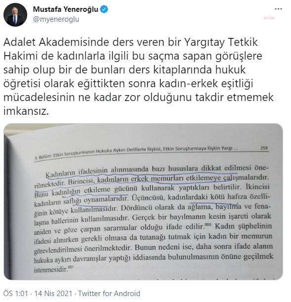 Kitapta yer alan kadınların ifadesi alınırken dikkat edilmesi gerekenlerle ilgili olarak yazdığı "kadınların erkek memurları etkileme gücü" ifadesini eleştiren Yeneroğlu, "Adalet Akademisinde ders veren bir Yargıtay Tetkik Hakimi de kadınlarla ilgili bu saçma sapan görüşlere sahip oluyor" dedi.