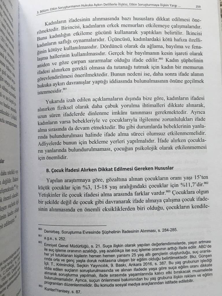 "Kadınların ifadesinin alınmasında bazı hususlara dikkat edilmesi önerilmektedir. Birincisi, kadınların erkek memurları etkilemeye çalışmalarıdır. Bunu kadınlığın etkileme gücünü kullanarak yaptıkları belirtilir. İkincisi kadınların saflığı oynamalarıdır. Üçüncüsü, kadınlardaki kötü hafıza özelliğinin kötüye kullanılmasıdır. Dördüncüsü olarak da ağlama, bayılma ve fenalaşma hallerinin kullanılmasıdır."