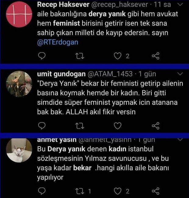 Bakan Yanık’ın atama kararının açıklanmasının ardından kendi mahallesinden insanların sert sözlerle eleştirildiği ortaya çıktı. Atama kararına tepki gösteren İstanbul Sözleşmesi karşıtı kişiler, sosyal medyadan Derya Yanık’ın bekar ve kadın olmasını hedef aldıkları görülüyor.