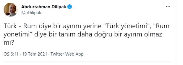 Erdoğan’ın Kuzey Kıbrıs parlamentosunda Türk-Rum karşıtlığı üzerinden konuşmasına gönderme yapan Dilipak, “Türk - Rum diye bir ayırım yerine "Türk yönetimi", "Rum yönetimi" diye bir tanım daha doğru bir ayırım olmaz mı?” dedi.