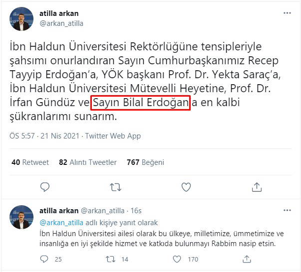 Atilla Arkan mesajında, Erdoğan'a, YÖK Başkanı Yekta Saraç'ın ve üniversitenin mütevelli heyetine teşekkür ettikten sonra Bilal Erdoğan'a 'en kalbi şükranlarını' sundu.