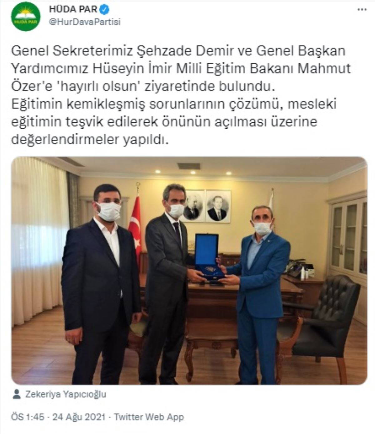 AKP'li Cumhurbaşkanı Recep Tayyip Erdoğan'ın kararla Milli Eğitim Bakanlığına getirilen Mahmut Özer, Hizbullah'a yakınlığıyla bilinen Hür Dava Partisi'nin (HÜDA-PAR) yöneticilerini makamında ağırladı.