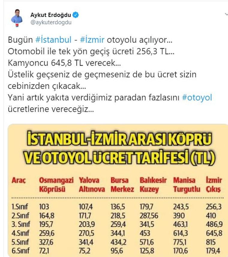 Erdoğdu'nun verdiği rakamlara göre bir otomobilin İstanbul'dan İzmir'e gidiş dönüş ücreti 500 TL'yi aşıyor.