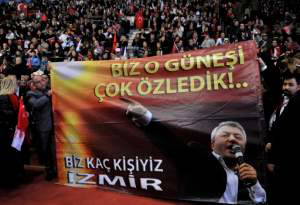 Atatürk ve Gazeteci Özkan'ın dev posterlerinin bulunduğu salona ayrıca, ''Memleket sevdalıları, memleket için siyasete'', ''Cumhuriyetimiz güneşle buluşuyor'' yazılı bez afişler asıldı.