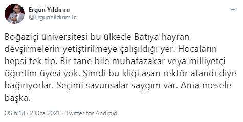 AKP’li Melih Bulu’nun Boğaziçi Üniversitesi’ne rektör olarak atanması büyük tepki çekerken iktidara yakınlığıyla bilinen Yeni Şafak yazarı Prof. Dr. Ergün Yıldırım'dan atamaya üniversiteyi ve öğretim üyelerini itham eden bir paylaşımla destek geldi.