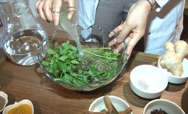 “Yarım demet maydanozun saplarıyla birlikte kullanılmasını tavsiye ediyorum. Maydanoz, İçeriğindeki A, C ve K vitaminleri sayesinde güçlü bir ödem atıcı özelliğine sahip. İlaveten yeşil çay ekleniyor. Yeşil çay yoksa, alternatif olarak kiraz sapı çayı da kullanılabilir. Mutlaka karanfil ve kan şekerini dengelemesi için bir adet çubuk tarçın ilave edilmeli. Bir fındık büyüklüğünde zencefil de eklenmeli. Zencefil anti-inflamatuar bir özelliğe sahiptir. Soğuk algınlığı ve gripte, vücut ısısını yükselterek, vücuttaki toksin maddelerin atılmasında yardımcı oluyor. 2 çay kaşığı kekik ilave edilebilir. Kekiğin içerisindeki karvakrol ve timol sayesinde çok güçlü bir anti-mikrobiyal özelliğe sahip. Son olarak 4 su bardağı kadar su ekleyerek tüm malzemeler kaynatılmalı. Kaynadıktan sonra 5 dakika kadar dinlendirilip, bütün malzemeleri süzüyoruz. En son ise, bir çay bardağı kadar limon eklenebilir. Tadının daha yumuşak olması tercihinde, bir elma ilave edilebilir. Detoksu, hamileler ve böbrek rahatsızlığı olanlar dışında herkesin günde 2-3 bardak olacak şekilde, 1 hafta boyunca tüketebilir."