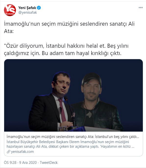 AKP'ye yakınlığı ile bilinen Yenişafak gazetesi, kendini İstanbul Büyükşehir Belediye Başkanı Ekrem İmamoğlu'nun seçim müziklerini yapan kişi olarak tanıtan bir kullanıcıyla ilgili bir haber yaptı. Ali Ata isimli kullanıcı, "Hayatımın en ko¨tu¨ projesi bu adama s¸arkı yapmak, desteklemek" diyerek bir paylaşım yaptı.