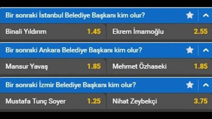 İstanbul seçimlerinde ise bahis şirketleri Cumhur İttifakı'nın adayı Binali Yıldırım'ın seçilmesi olasılığını yüksek görüyor. Yıldırım'ın oranı 1.45 olurken, Millet İttifakı'nın adayı Ekrem İmamoğlu'nun oranı ise 2.55. Yani Yıldırım'ı seçen bir bahisçi, Yıldırım'ın kazanması halinde 100 TL'ye 145 TL kazanıyor. İmamoğlu'nda ise aynı miktar için kazanç 255 TL olacak.