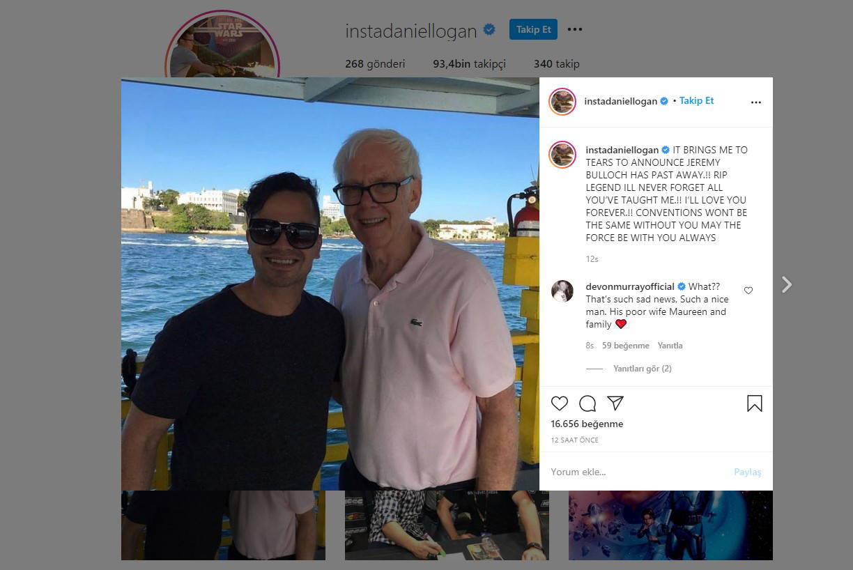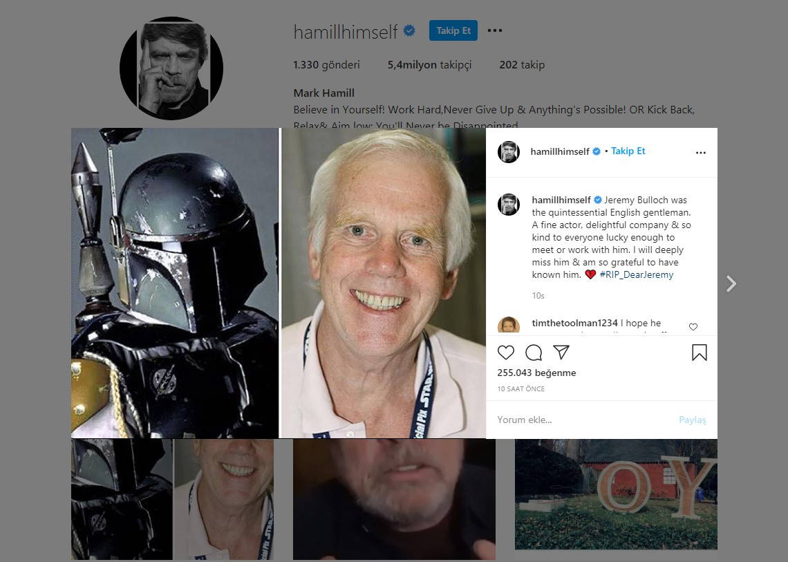 Yıldız Savaşları’nın orijinal serisinde Bulloch ile karşı karşıya oynayan Mark Hamill de sosyal medyadan açıklama yaptı. Luke Skywalker karakterini canlandıran Hamill, “Bulloch tam bir İngiliz beyefendisiydi. Onu çok özleyeceğim ve onu tanımış olmaktan dolayı çok mutluyum. Onunla tanıştığım ve çalıştığım için çok mutluyum” dedi.