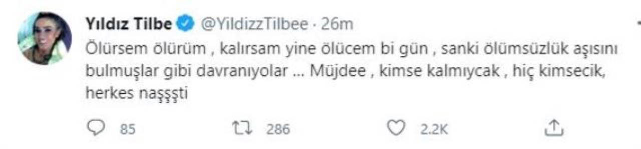 Son olarak aşıya karşı olduğu söyleyen isimlerden biri de ünlü şarkıcı Yıldız Tilbe oldu. Tilbe, sosyal medya hesabından yaptığı açıklamada aşı vurulmak istemediğini dile getirdi. Ünlü sanatçının sözleri, takipçilerinin tepkisini aldı.