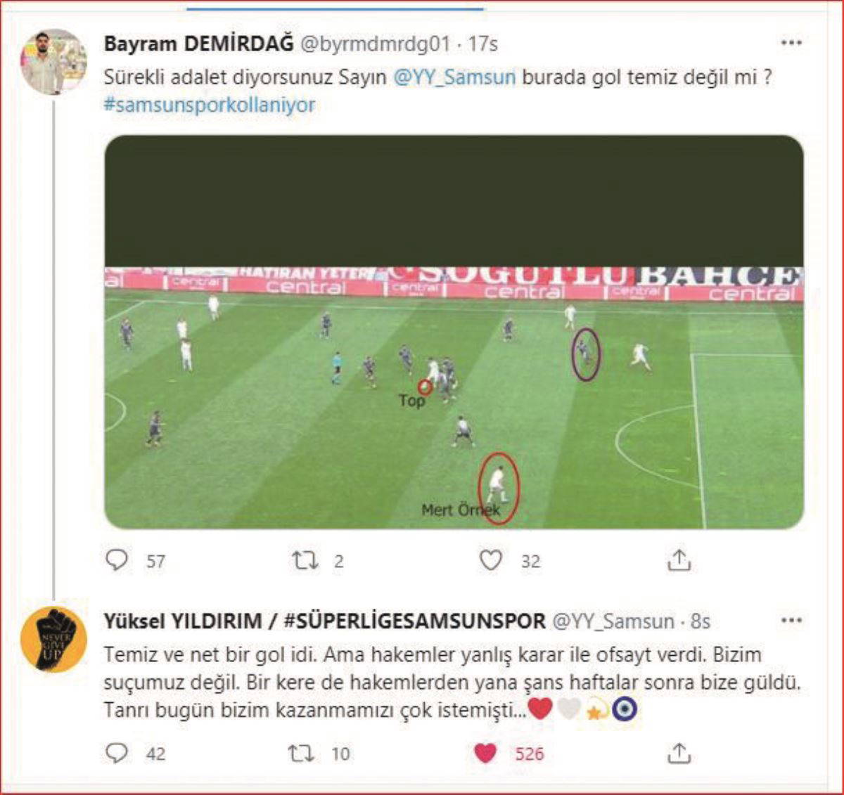 Sosyal medyada bir takipçi Yılport Samsunspor Başkanı Yüksel Yıldırım'a pozisyonun ofsayt olmadığı, "temiz bir gol değil mi? diye sordu. Başkan Yüksel Yıldırım ise ofsayt olmadığını temiz bir gol olduğunu fakat bunun hakem suçu olduğunu belirterek, "Temiz ve net bir gol idi. Ama hakemler yanlış karar ile ofsayt verdi. Bizim suçumuz değil. Bir kere de hakemlerden yana şans haftalar sonra bize güldü. Tanrı bugün bizim kazanmamızı çok istemişti" yorumunda bulundu" dedi.