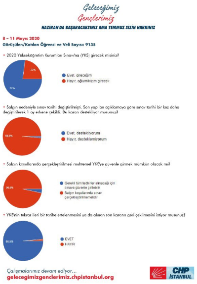 Öğrenci ve velilerin sınav tarihinin öne çekilmesiyle ilgili en büyük kaygılarından biriyse koronavirüs salgını. Çalışmada “Salgın koşullarında gerçekleştirilmesi muhtemel YKS'ye güvenle girmek mümkün olacak mı?” sorusunu katılımcıların yüzde 96,7’si “Salgın koşullarında sınav gerçekleştirilmemelidir” şeklinde cevapladı.Sorulara gelen yanıtlarCHP İstanbul İl Başkanlığı’nın 8 Mayıs’ta başladığı çalışmada bugüne kadar 9 bin 135 öğrenci ve veliye yöneltilen sorulara gelen yanıtlar şöyle: